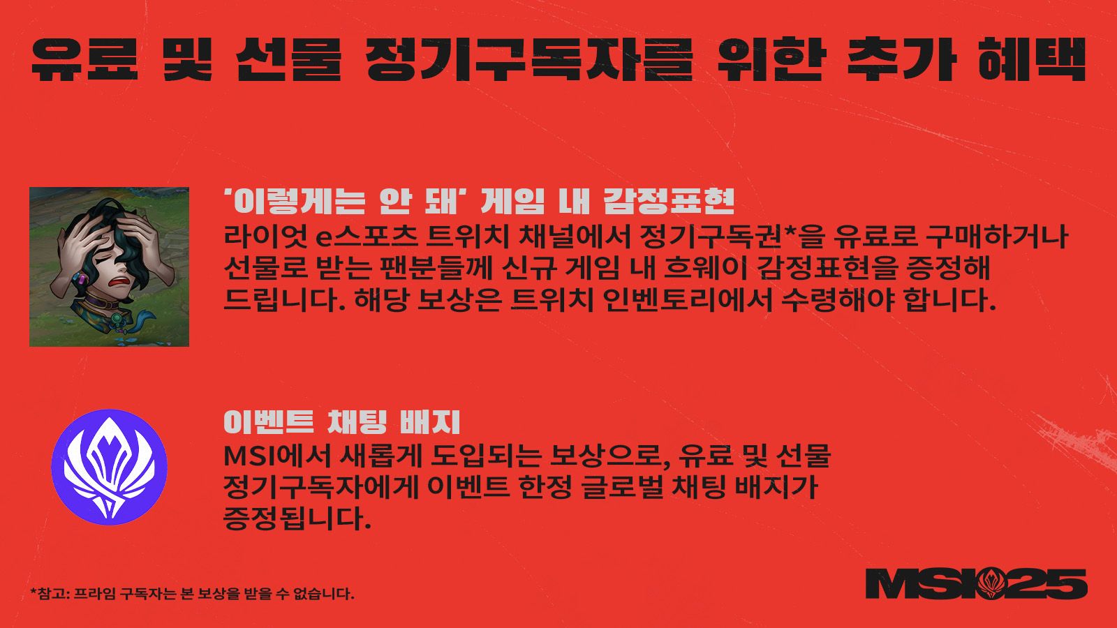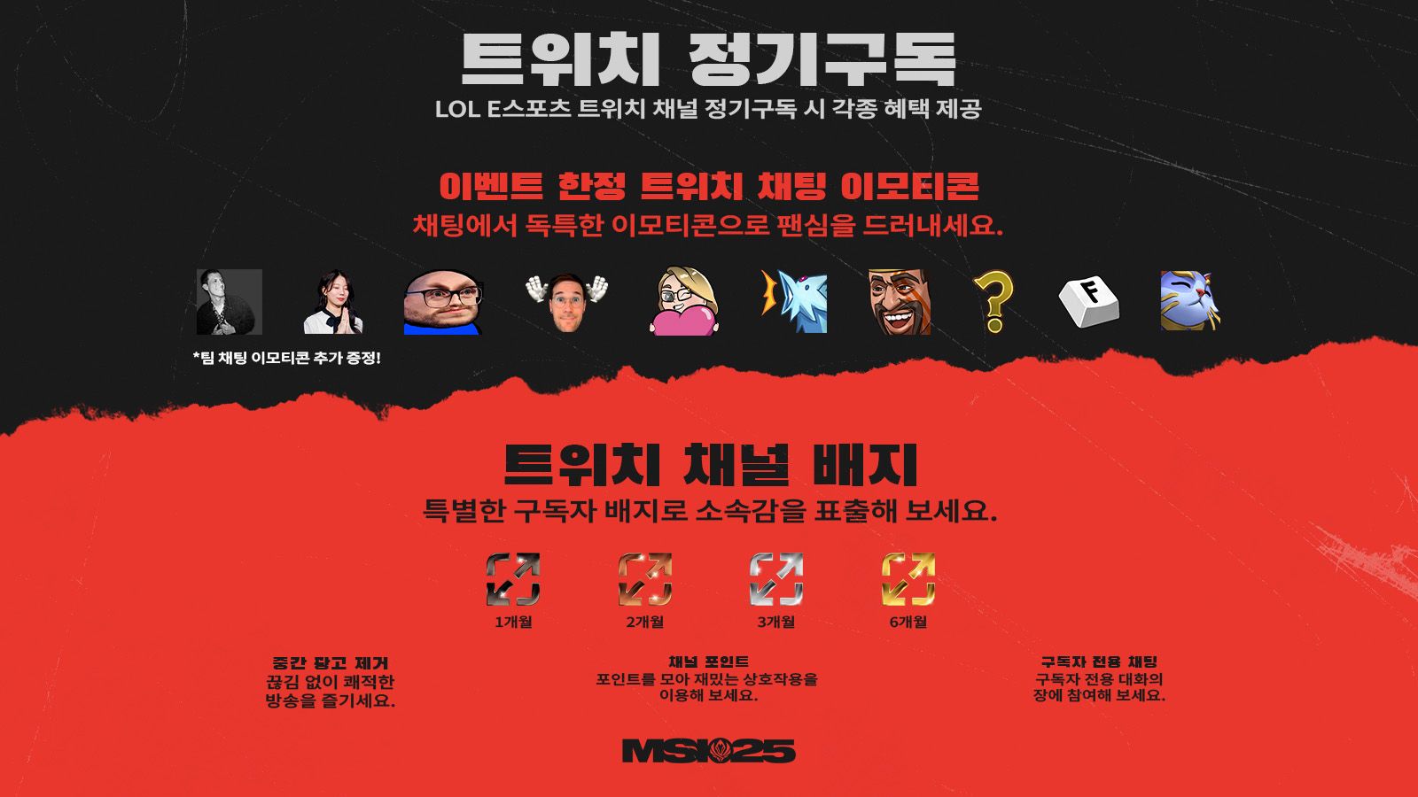 MSI에서 트위치 정기구독 혜택이 돌아옵니다! LoL e스포츠 트위치 채널 정기구독자는 커스텀 채팅 이모티콘과 배지, 중간 광고 제거, 생중계 중 소개되는 특별한 혜택을 누릴 수 있습니다. 다시 한번 말씀드리자면, 라이엇은 수익금 일부를 e스포츠 생태계에 속한 리그와 팀 지원을 위한 글로벌 수익 풀에 적립할 것입니다.