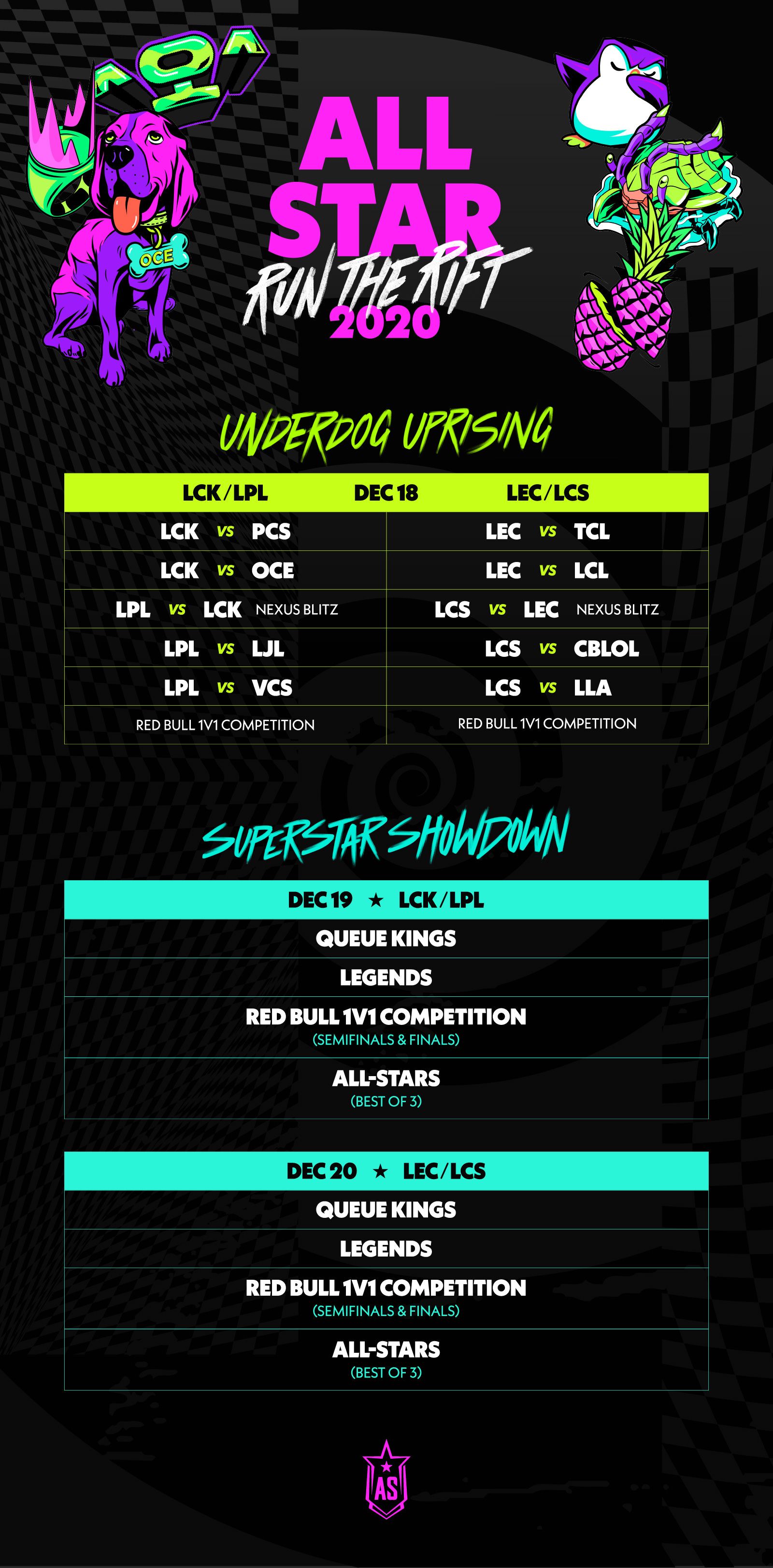 Les 19 et 20 décembre, trois super-équipes des LCK, LCS, LEC et LPL s'affronteront. Les LCK et la LPL monteront virtuellement sur scène samedi, tandis que les LCS et les LEC joueront le dimanche.