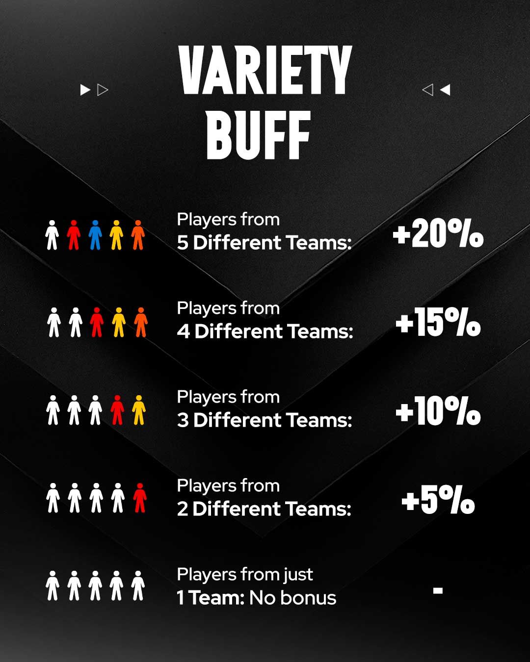 To address this and bring more variety to lineups, we’ll be granting a bonus to players who select team members from different teams. The bonus will be as follows: