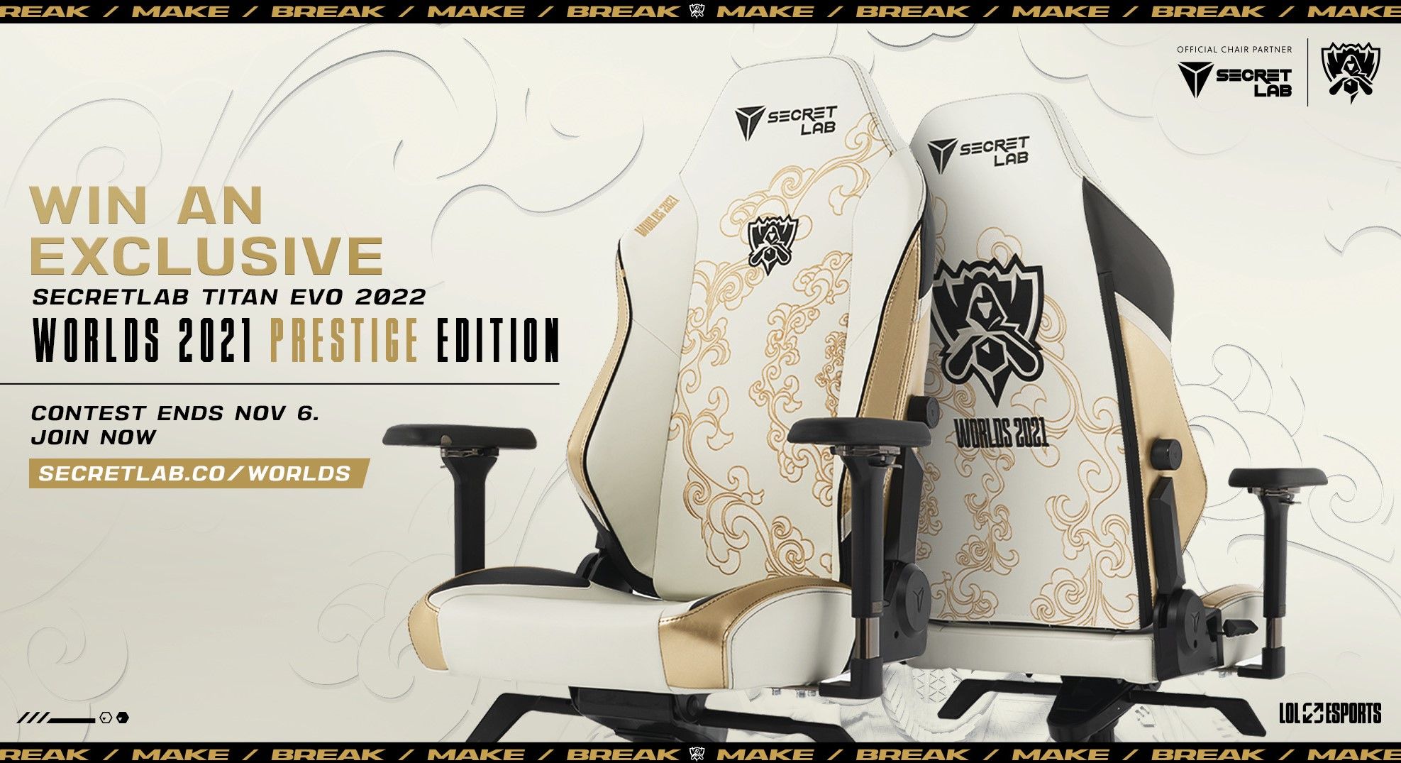Stand a chance to win an exclusive Secretlab TITAN Evo 2022 Worlds 2021 Prestige Edition (Size R) chair. Upholstered in a unique gold-on-white to commemorate the 2021 League of Legends World Championship.