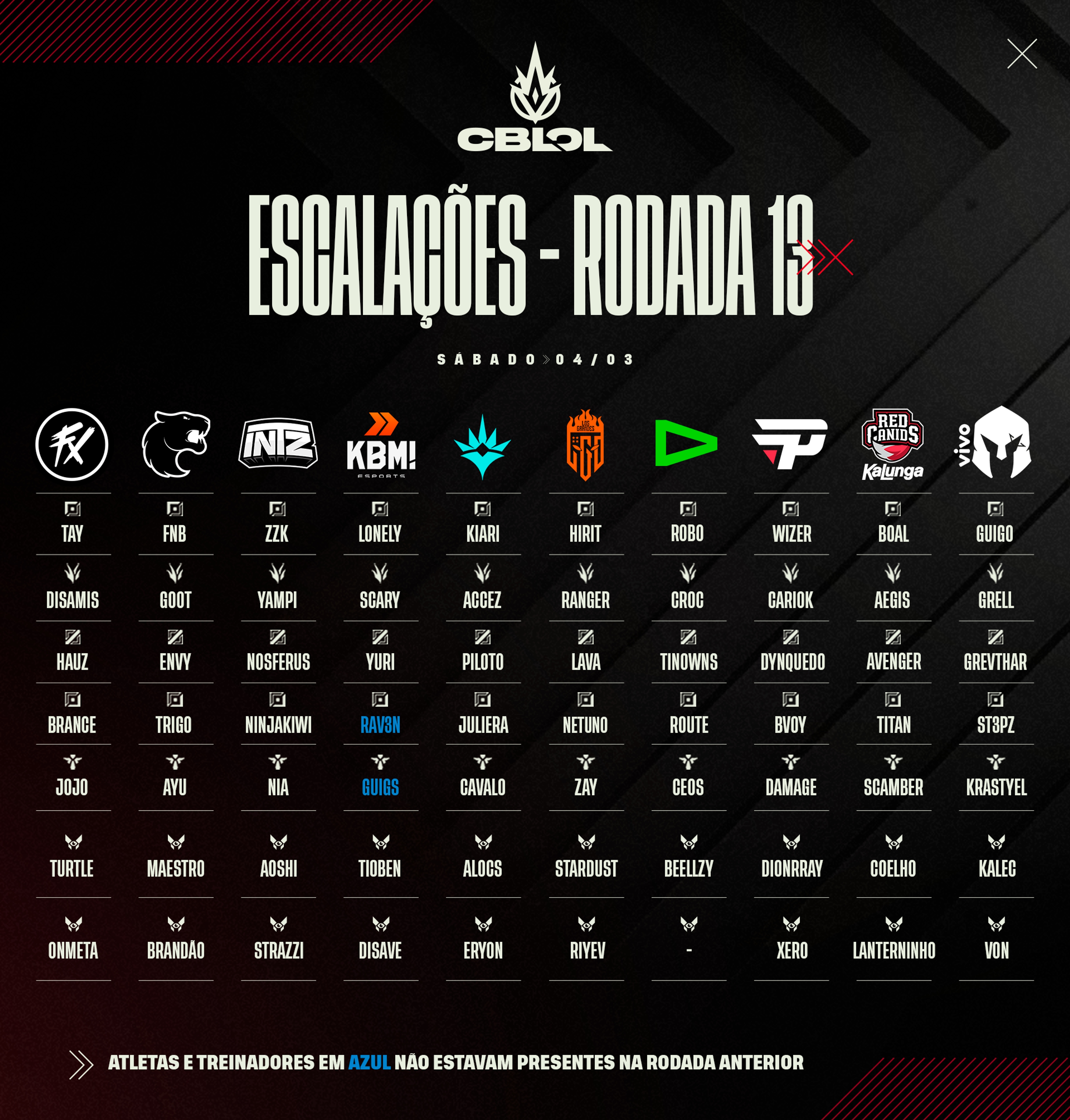 CBLOL 2023 - 1ª Etapa: Escalações Rodada 13