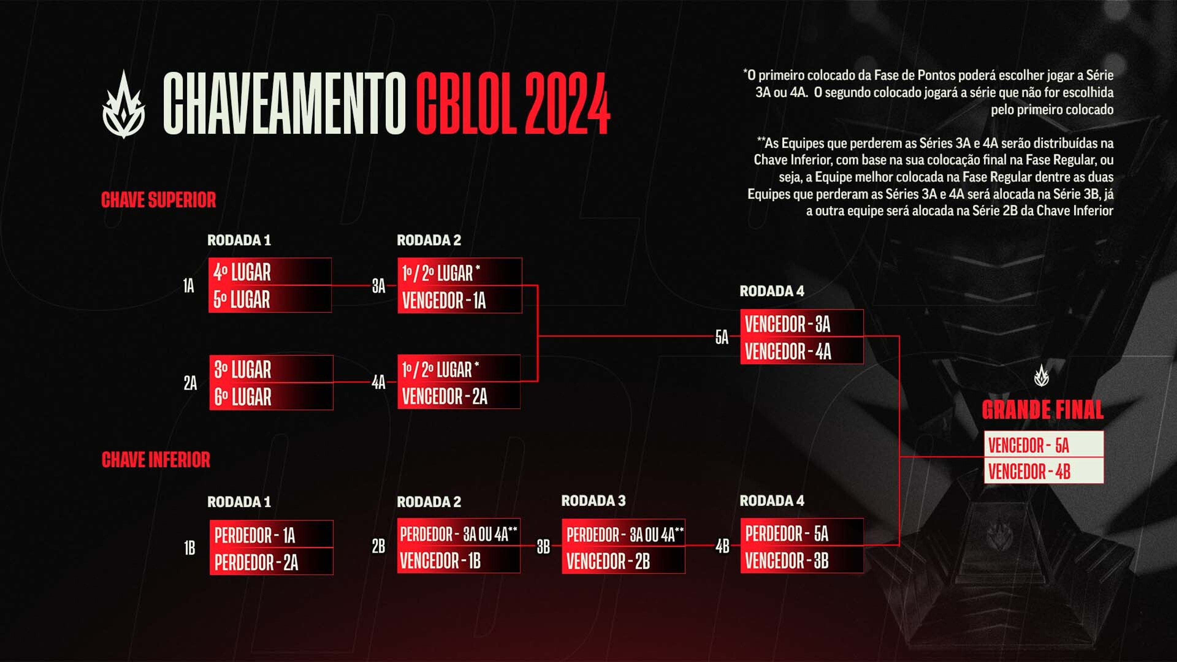A Fase Eliminatória, por sua vez, passou por uma alteração no chaveamento. Ouvimos diversos feedbacks após a última Etapa, e o sistema na Chave Inferior foi alterado - enquanto o da Chave Superior segue mantido. A Chave Inferior funcionará em formato de Escalada, ganhando uma rodada a mais em relação ao formato anterior. Dessa forma, o seed das equipes que perderem na Chave Superior fará diferença em relação aonde elas serão posicionadas na Inferior, conforme mostrado na imagem abaixo.
