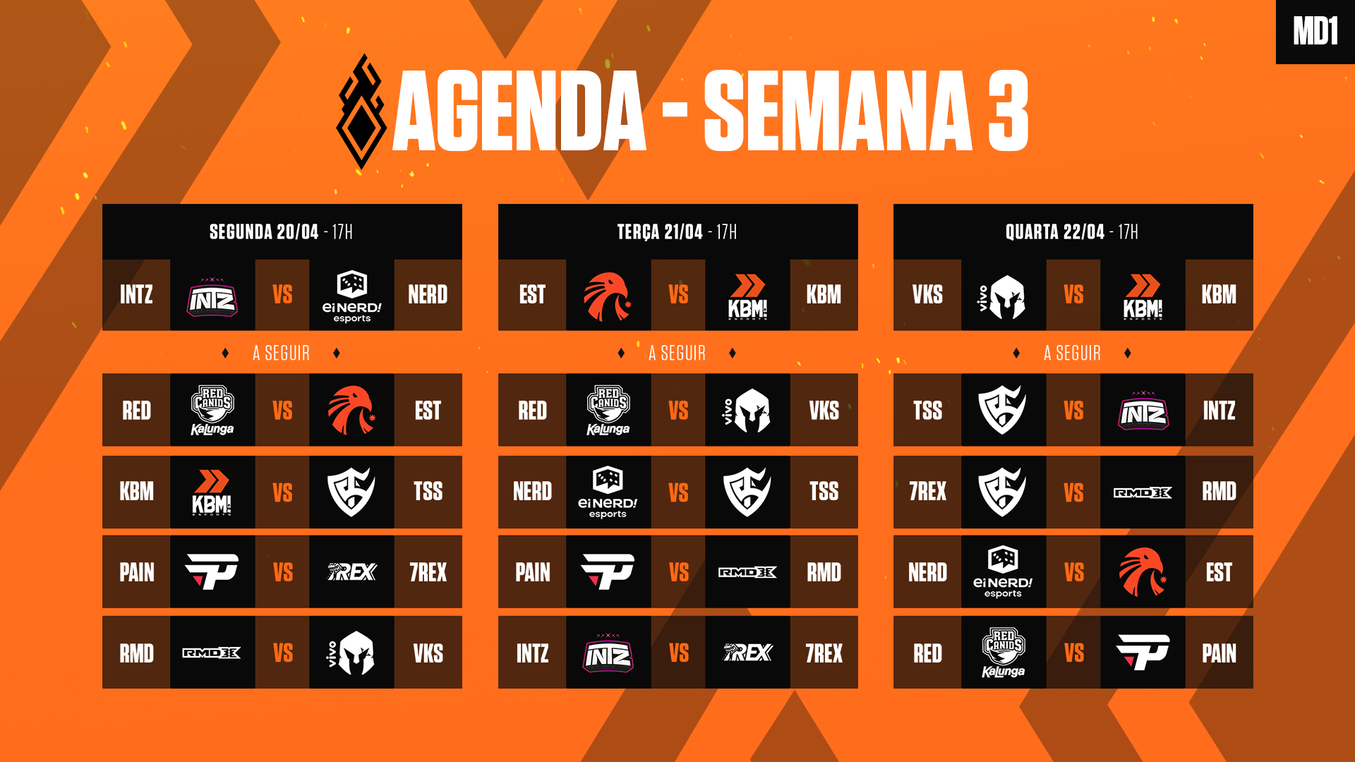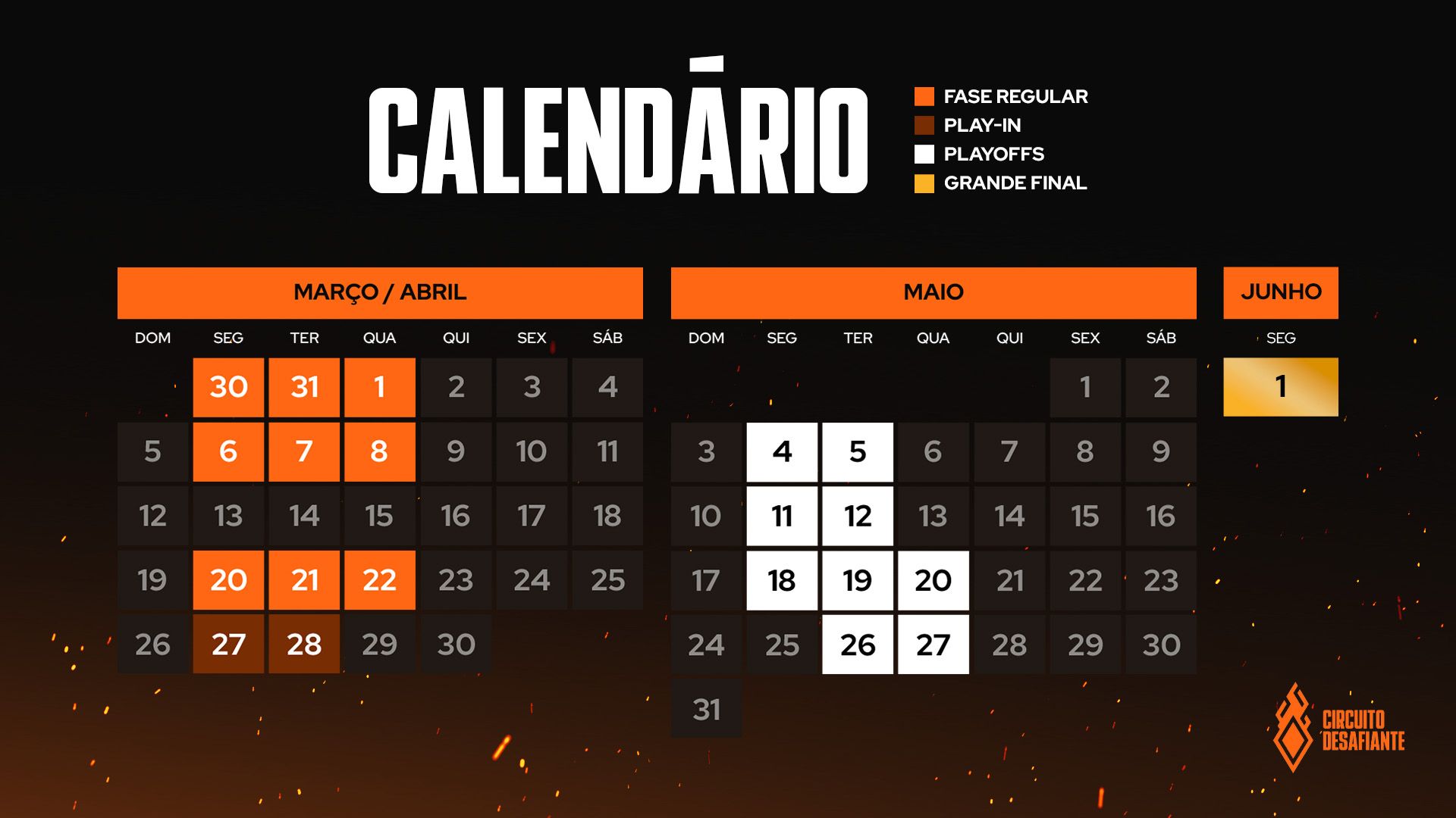 A Fase Regular do Circuito Desafiante consistirá em nove dias de disputa. Todos os times se enfrentam em turno único - em formato Md1 - se desdobrando, portanto, na disputa de cinco partidas por dia. Esta é a agenda completa de jogos: