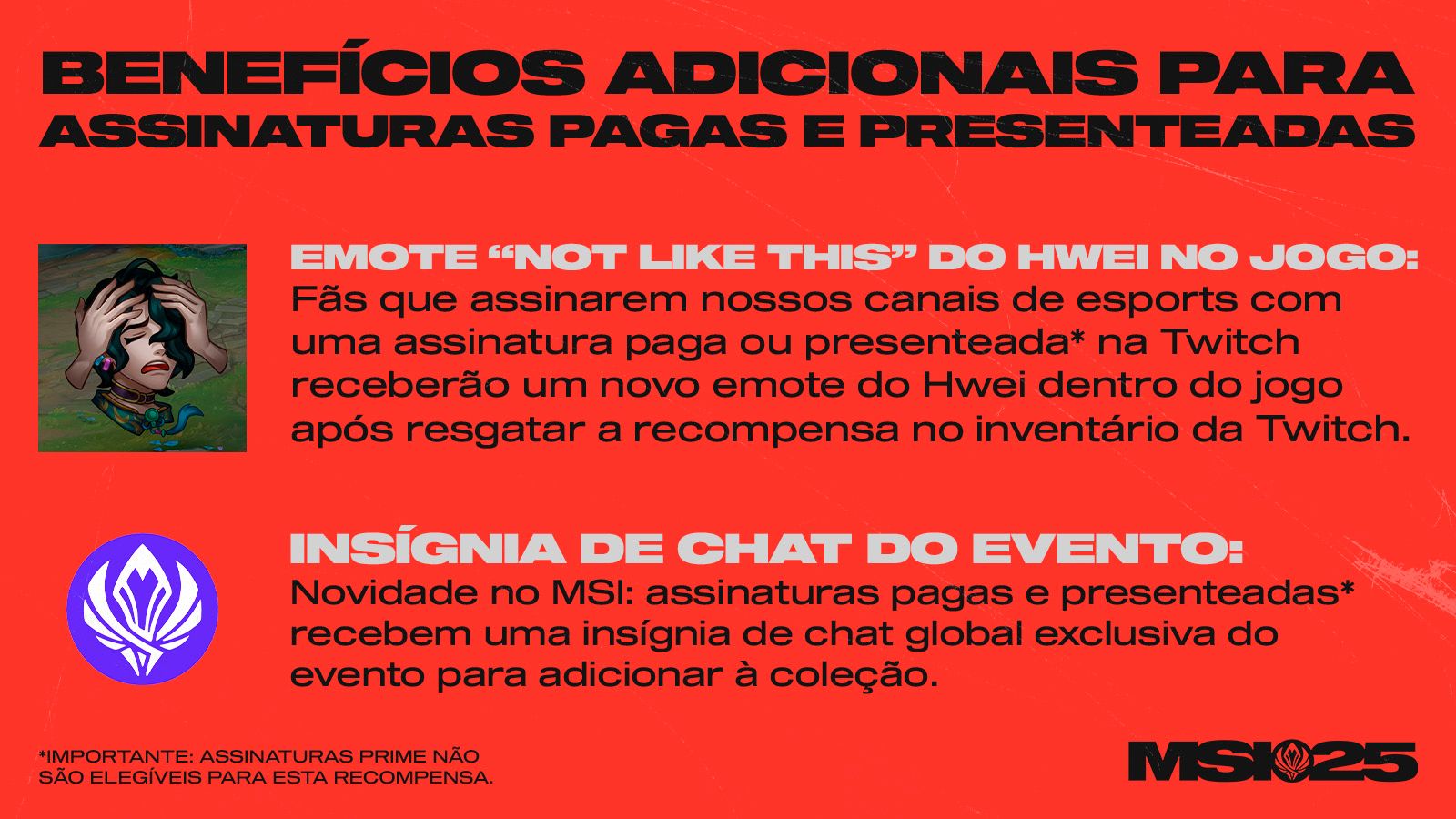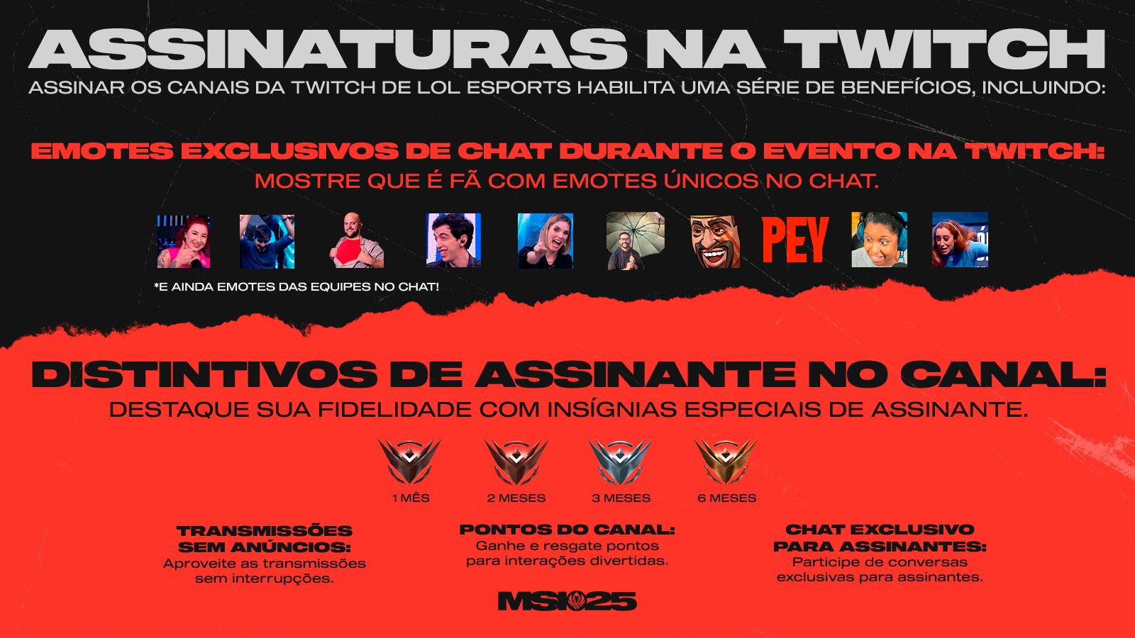 Os subs na Twitch estão de volta no MSI! Todos os subs dos canais de LoL Esports na Twitch aproveitam benefícios como emotes personalizados no chat, insígnias, transmissões sem anúncios e reconhecimento durante as transmissões ao vivo. Vale lembrar que a Riot destina parte da receita para o Fundo Global de Reserva, que apoia diretamente as ligas e equipes do ecossistema de LoL Esports.