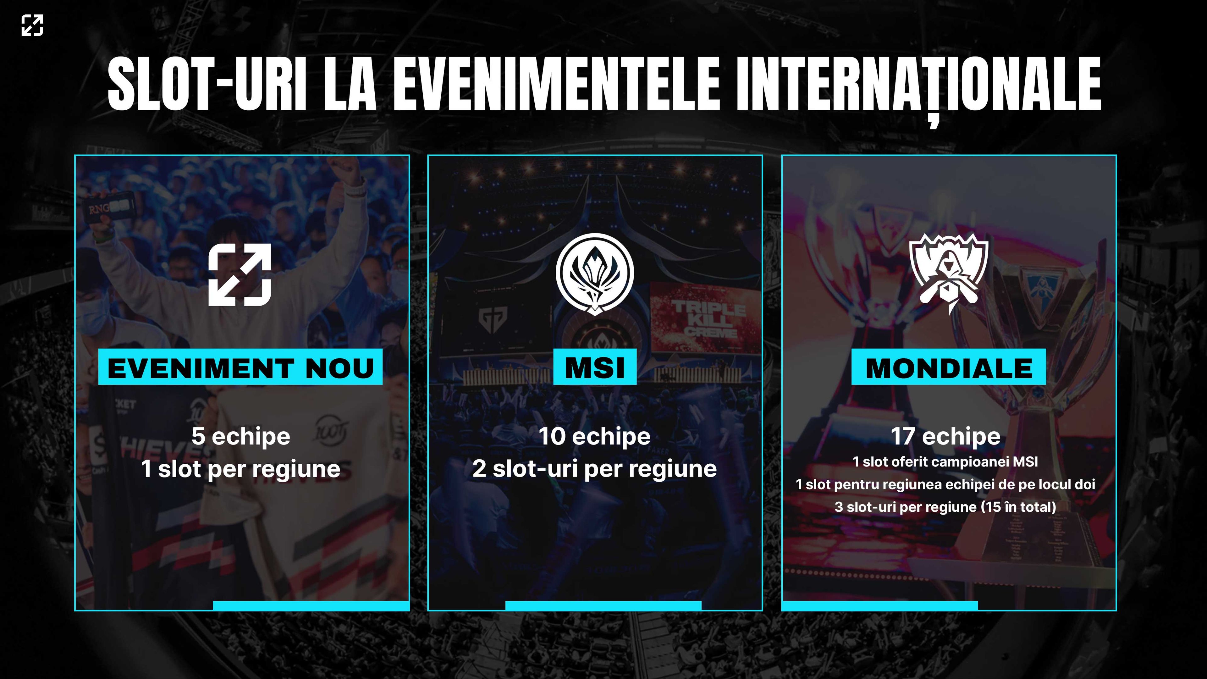 Cu o potențială trecere la un total de cinci regiuni (Americi, LEC, LCK, LPL și APAC), încercăm o abordare proaspătă a împărțirii locurilor la evenimentele noastre internaționale. Fiecare regiune ar avea un slot la noul nostru eveniment (în total 5 echipe), două sloturi la MSI (în total 10 echipe) și trei sloturi la Mondiale. În plus, campioana MSI și regiunea echipei de pe locul doi ar continua să obțină sloturi suplimentare la Mondiale pentru ligile lor, aducând numărul total al echipelor de la Mondiale la 17. Mondialele 2025 ar avea preliminarii sub forma unui singur meci de tip ''3 din 5'', câștigătoarea alăturându-se celorlalte 15 echipe calificate direct în etapa în stil elvețian.