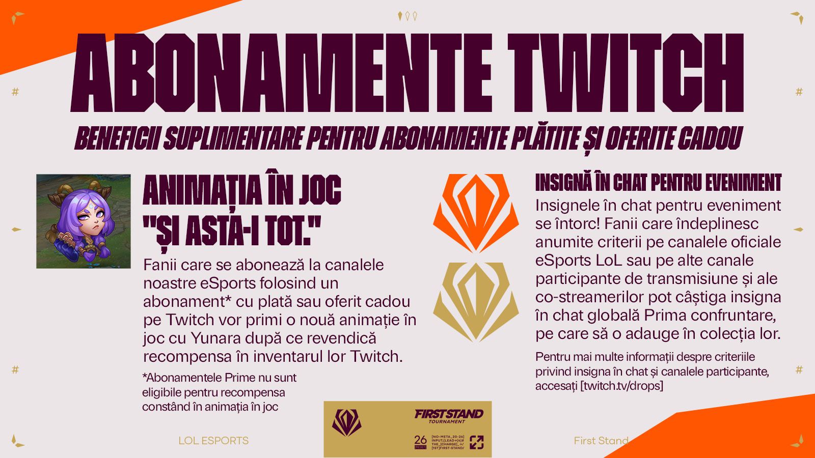 Toți abonații Twitch la canalele eSports LoL participante* pe durata turneului Prima confruntare se bucură de beneficii precum animații personalizate în chat, insigne și vizionare fără reclame. Riot va aloca o parte din venituri către fondul global de venituri, care susține în mod direct ligile și echipele din ecosistemul eSports LoL.