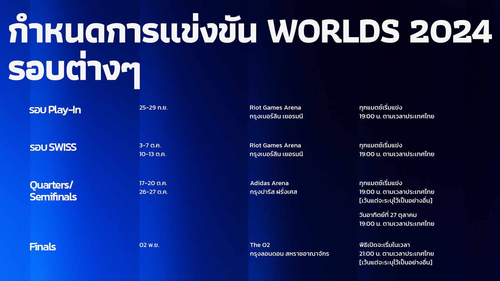 การแข่งขัน Worlds จะเริ่มต้นรอบ Play-In ในวันที่ 25 กันยายนและจะปิดฉากด้วยรอบ Finals ในวันที่ 2 พฤศจิกายน สำหรับแฟน ๆ ที่มารับชมการแข่งขันในสถานที่จัดงาน ก็สามารถเข้าร่วม Worlds Fan Fest ที่จะกลับมาจัดขึ้นตั้งแต่วันที่ 31 ตุลาคมจนถึงรอบ Finals ในกรุงลอนดอนด้วย