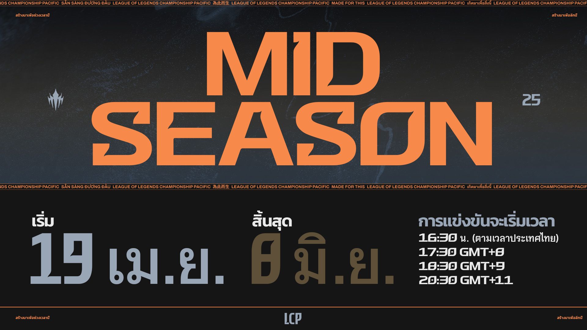 LCP Mid Season จะจัดขึ้นตั้งแต่วันที่ 19 เมษายนถึง 8 มิถุนายน เวลาเริ่มต้นการแข่งขัน LCP ในแต่ละวันจะเร็วขึ้นครึ่งชั่วโมง โดยจะเริ่มแข่งในเวลา 16:30 น. (ตามเวลาประเทศไทย)