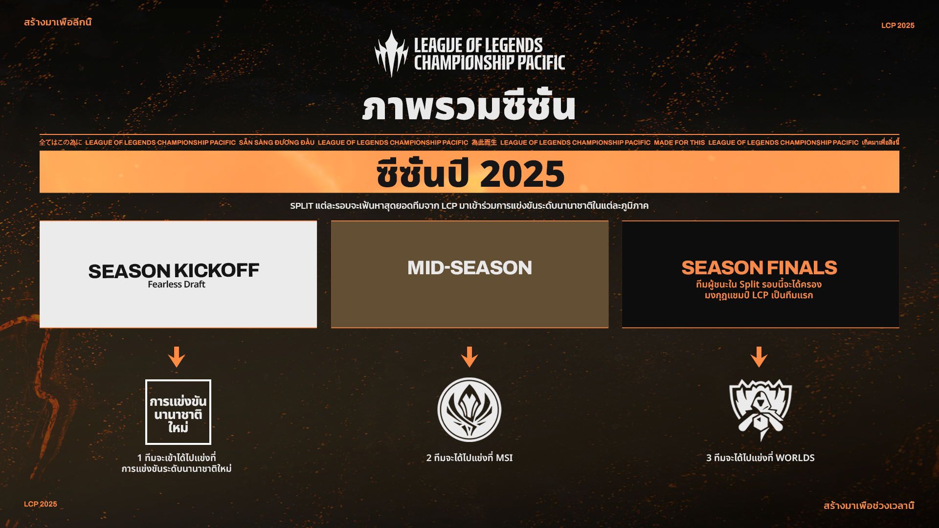 ซีซั่นของปี 2025 จะประกอบด้วย Split 3 ครั้ง ได้แก่ Season Kickoff, Mid Season และปิดท้ายด้วย Season Finals Split แต่ละครั้งจะคัดเลือกทีมที่เก่งที่สุดจากลีกในแต่ละภูมิภาคมาเข้าร่วมทัวร์นาเมนต์ระดับนานาชาตินี้ โดยผู้ชนะของ Season Finals จะได้รับตำแหน่งแชมป์ LCP ไปครองเป็นทีมแรก