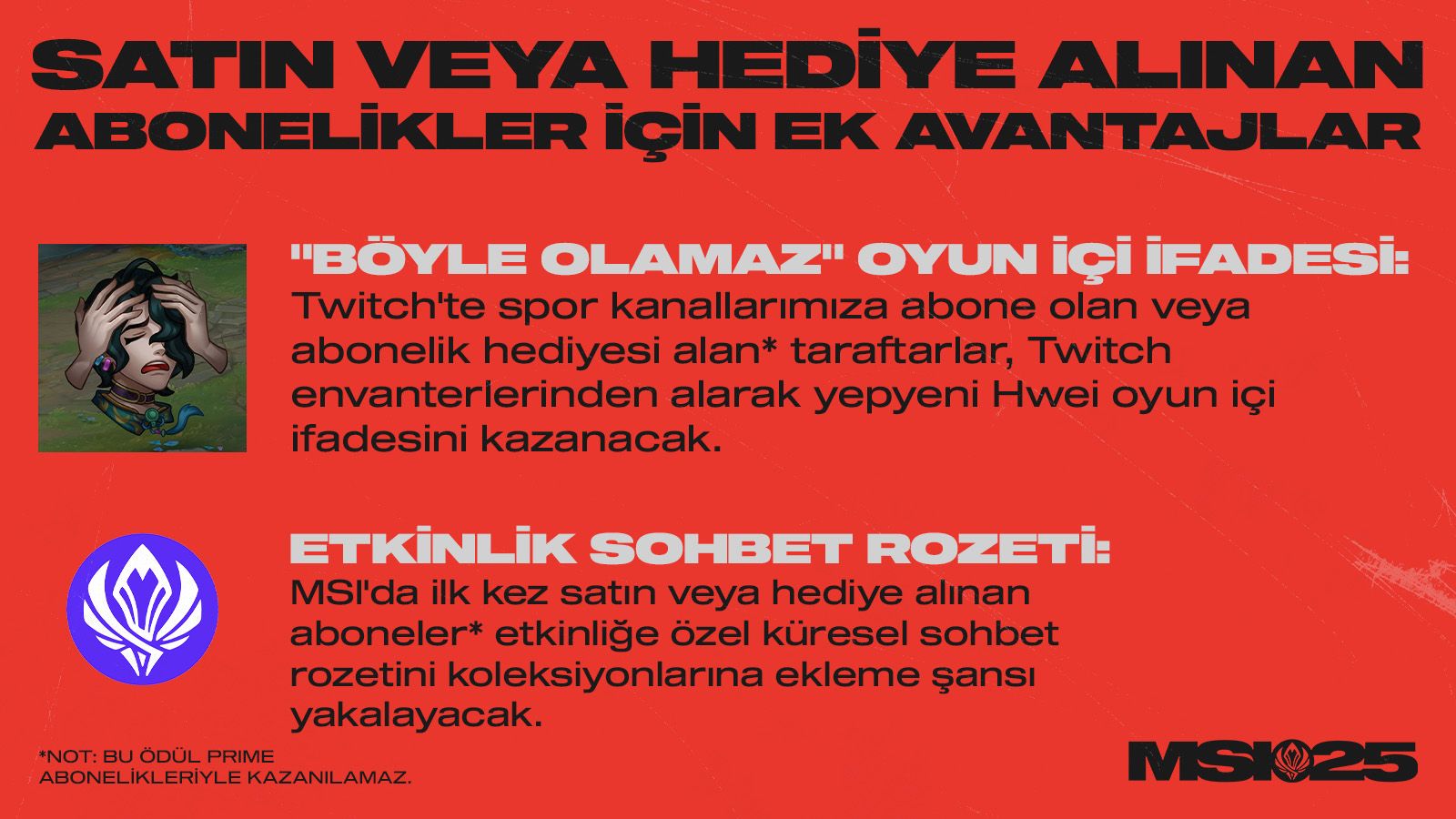 Etkinlik Sohbet Rozeti: MSI'da ilk kez satın veya hediye alınan aboneler* etkinliğe özel küresel sohbet rozetini koleksiyonlarına ekleme şansı yakalayacak.