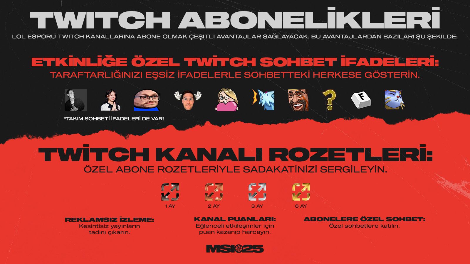 Twitch Abonelikleri MSI'da geri dönüyor! LoL Esporu kanallarının tüm Twitch aboneleri özel sohbet ifadeleri, rozetler, reklamsız izleme ve canlı yayın görünürlüğü gibi çok sayıda avantaja erişecek. Hatırlatma: Riot, elde edilen gelirin bir kısmını LoL Esporu ekosistemindeki ligleri ve takımları destekleyen Küresel Gelir Havuzuna aktaracak.