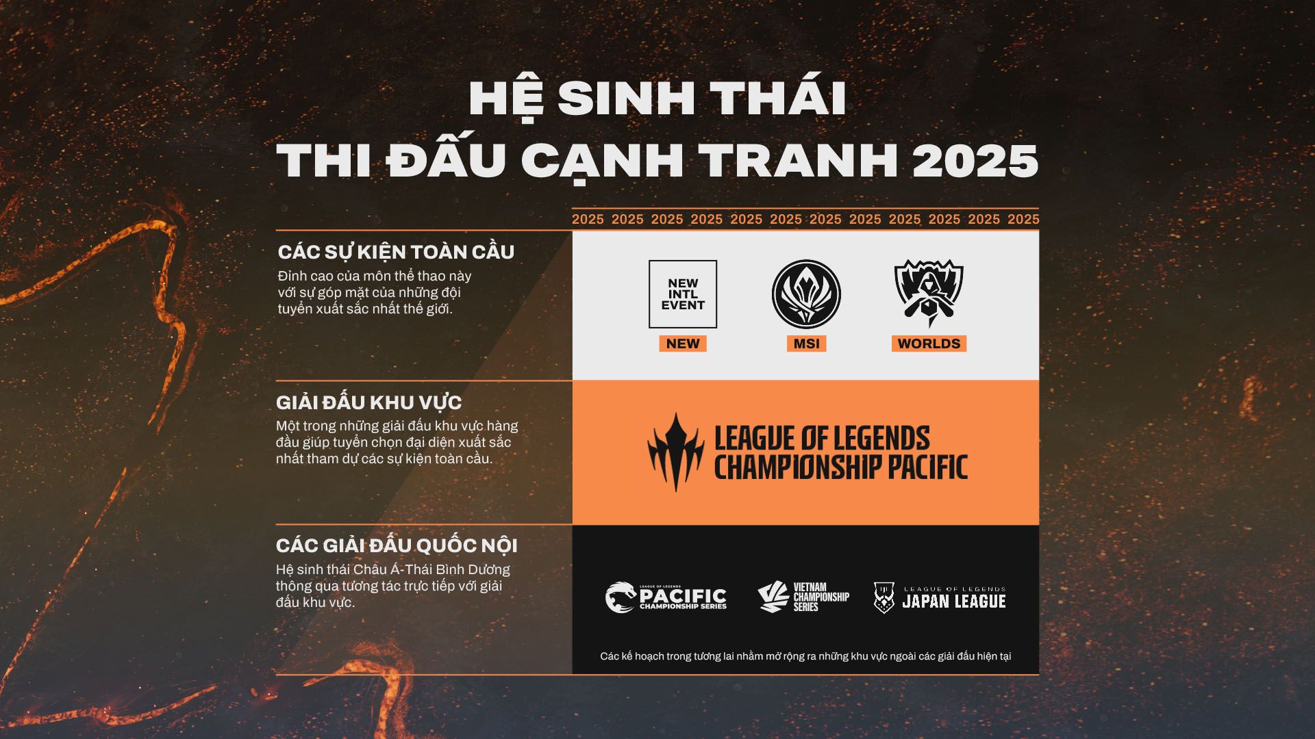 LCP sẽ đóng vai trò là một giải đấu khu vực hàng đầu thuộc hệ sinh thái Châu Á-Thái Bình Dương và được coi là con đường duy nhất để các đội tuyển trong khu vực giành quyền tham dự các sự kiện toàn cầu trong năm tới. Ở dưới LCP một bậc sẽ là PCS, VCS và LJL. Các giải đấu này sẽ tiếp tục hoạt động trong khu vực của mình để tìm kiếm những đội tuyển xuất sắc nhất nhằm cạnh tranh giành một suất Khách Mời thông qua giải đấu thăng hạng và xuống hạng. Thông tin chi tiết về giải đấu đó sẽ sớm được công bố.