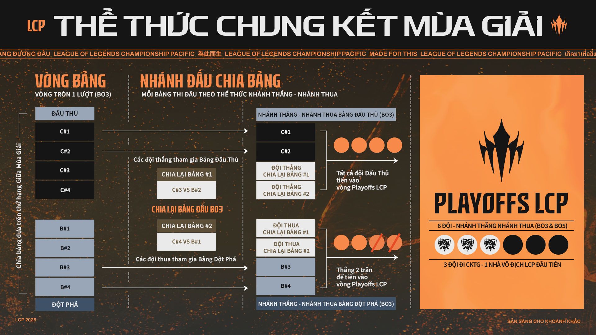 Tiếp theo, trong Vòng Playoffs, 6 đội còn lại sẽ trải qua một loạt các trận BO3 và Best-of-5 (BO5) theo thể thức Nhánh Thắng - Nhánh Thua để tranh suất tham dự CKTG. Đội tuyển đứng đầu cũng sẽ trở thành nhà vô địch LCP đầu tiên!