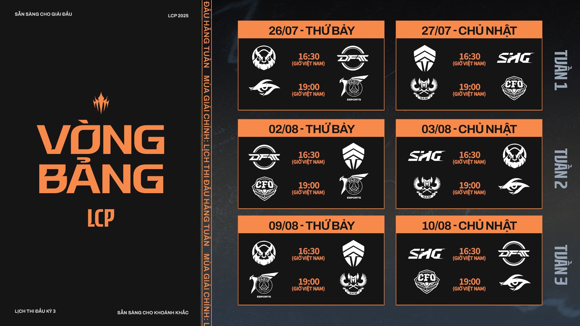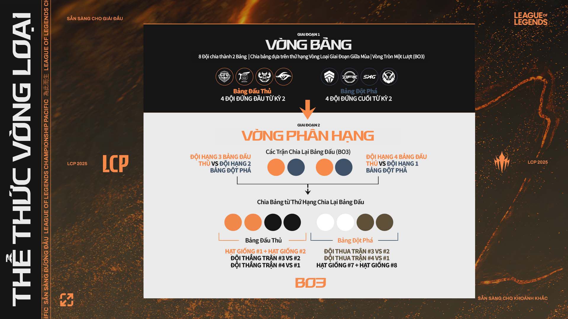 Sau đây là lịch thi đấu cho Vòng Bảng của LCP 2025 Giai Đoạn Chung Kết Mùa: