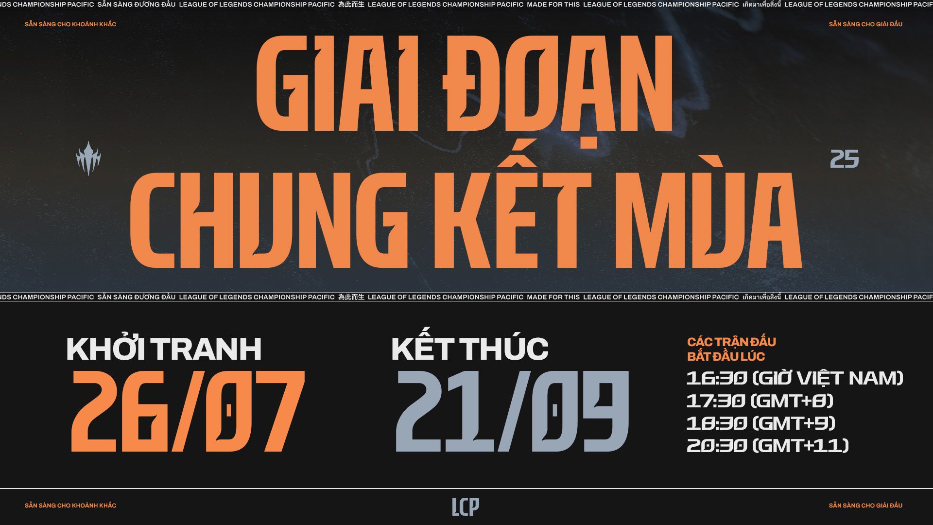 Tuần Lễ Chung Kết LCP 2025 diễn ra từ ngày 20 - 21/09 sẽ được tổ chức tại Cung Thể Thao Tiên Sơn ở Đà Nẵng, Việt Nam. Chúng tôi sẽ sớm thông báo thêm các thông tin chi tiết.