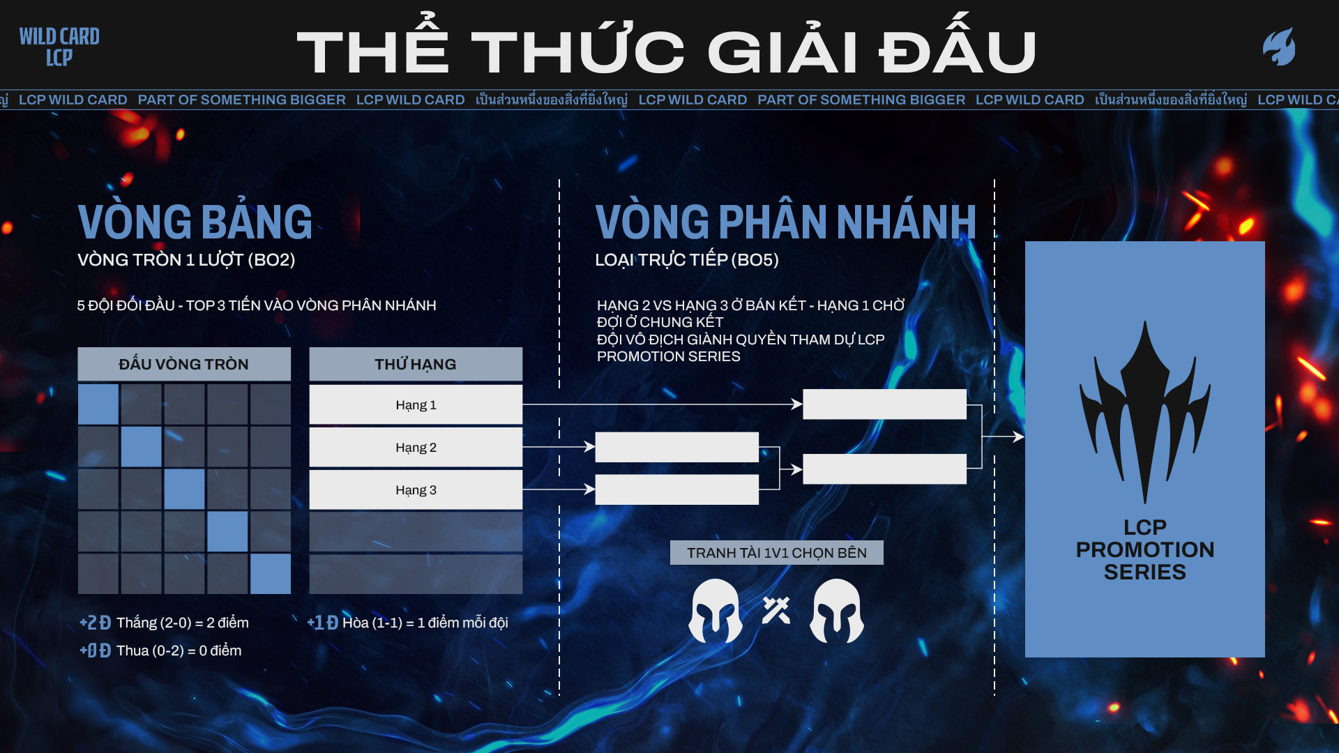 Vòng Playoffs Wild Card LCP sẽ diễn ra từ ngày 28 - 31/08 và được tổ chức trực tuyến. Người hâm mộ có thể theo dõi mọi diễn biến tại các liên kết bên dưới.