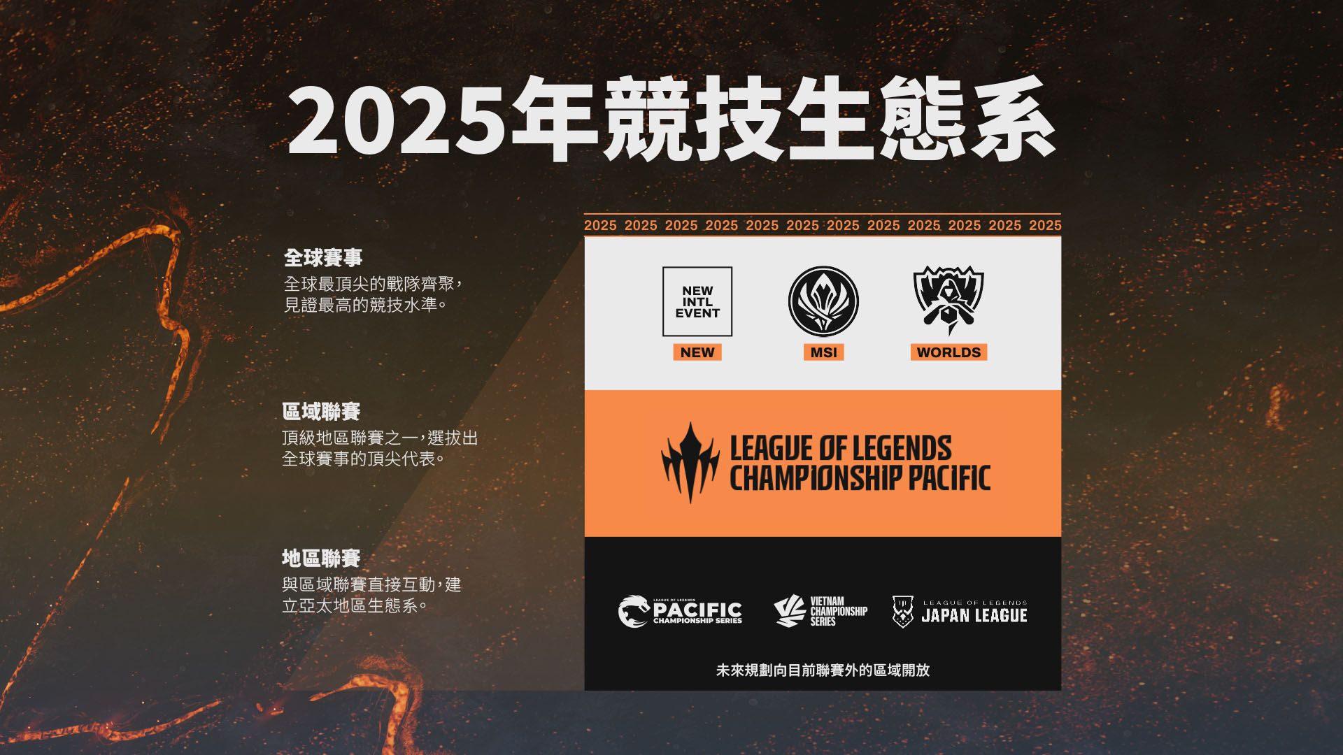 LCP將成為亞太地區生態系的頂級區域賽事,也將是亞太地區隊伍明年取得全球賽事資格的唯一途徑。在LCP底下,將分為PCS、VCS和LJL等聯賽。這幾個聯賽都將在所屬區域持續營運,挖掘頂尖隊伍參加升降賽,爭取客座隊伍席位。更多賽事細節即將公開。