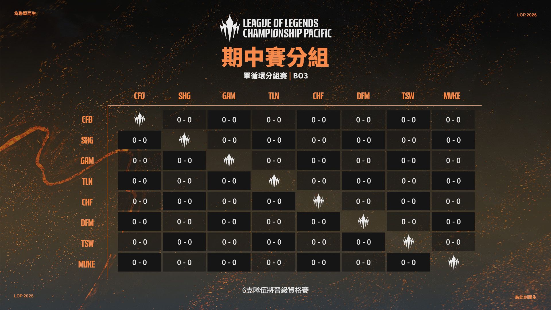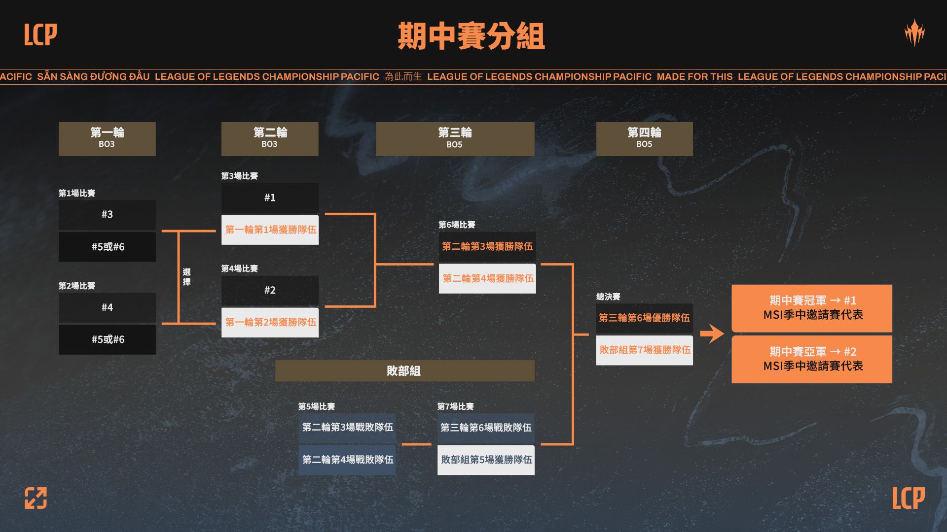 在 LCP 期中賽,各隊將爭奪 MSI 季中邀請賽代表 LCP 出賽的兩個名額。在期中賽的例行賽中,隊伍將以單循環 Bo3 賽制進行比賽,前六名隊伍將晉級資格賽。