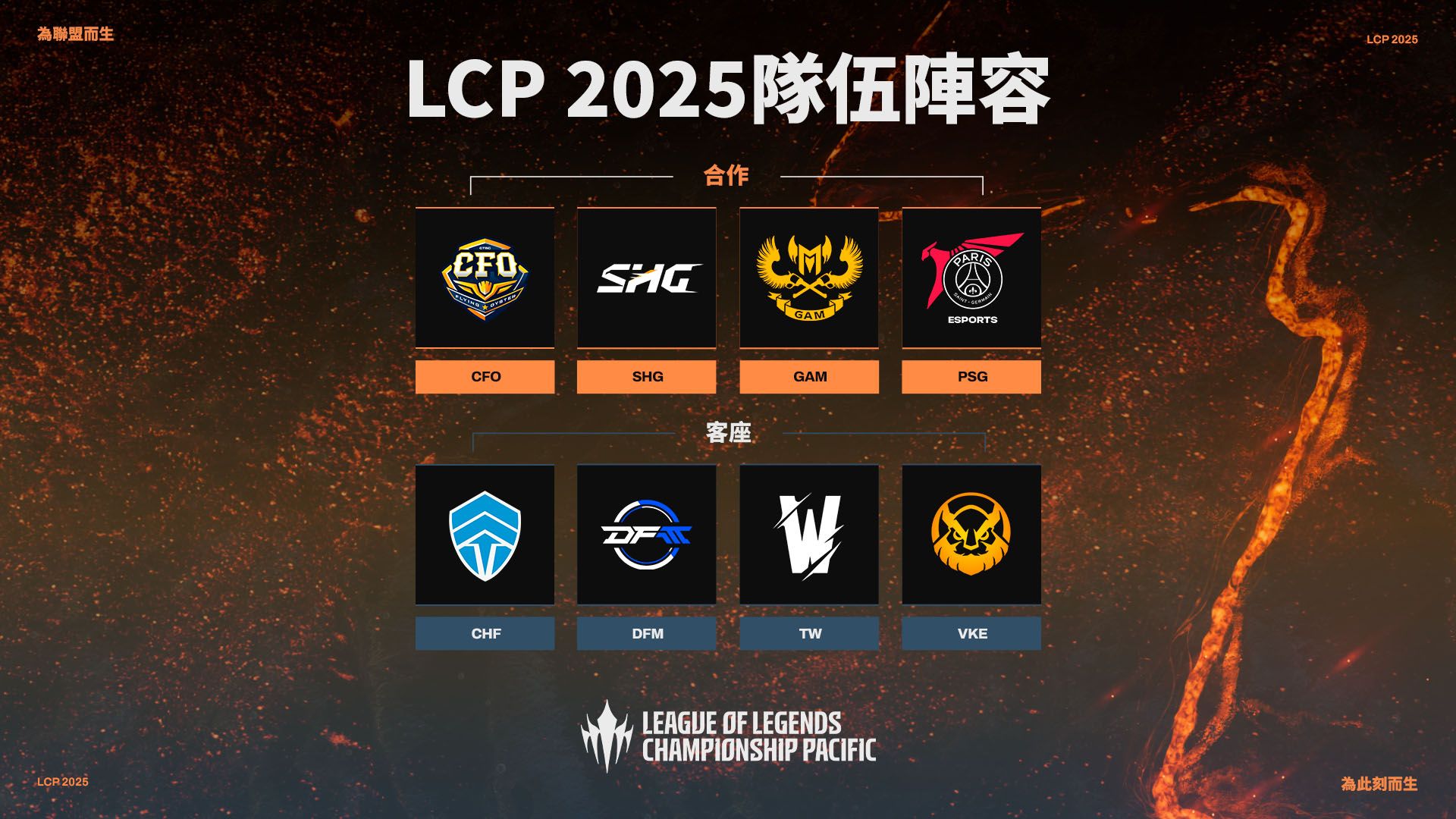 我們希望確保所選隊伍在這些原則之間達到平衡,並體現出亞太聯賽電競的獨特精髓!因此,我們現在要自豪地揭曉LCP首個賽季的隊伍陣容,為即將到來的2025年電競賽季做好準備: